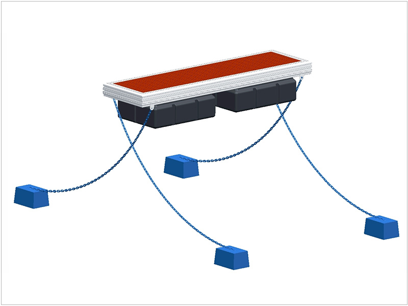 يرتكز الجسر العائم على الكابل المطاطي المصنوع من الألياف المطاطية والخرسانة تحت قاع البحر.جهاز sealex قوي ومستقر للغاية ، بحيث يحافظ الجسر العائم دائمًا على نفس الوضع الأفقي وارتفاع حد الطفو في تغير المد ، ويمكنه ضبط الطفو في نطاق 70٪.